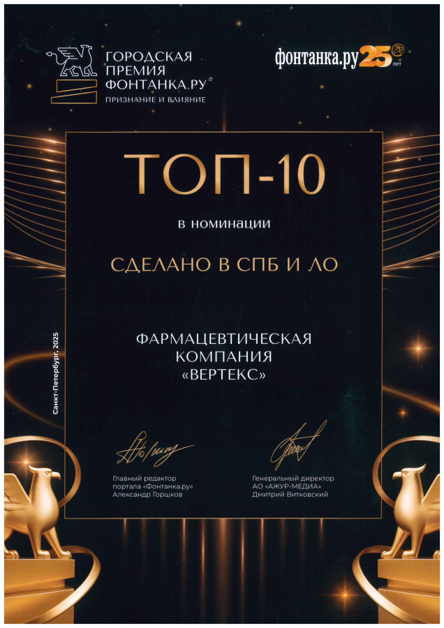 "Фонтанка.ру - Признание и влияние", 2022 г.: топ-10 финалистов в номинации "Сделано в СПб и ЛО" - третье место в числе лидеров из разных отраслей и первое среди фармпроизводителей по итогам онлайн-голосования