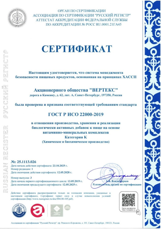 В 2025 году после прохождения ресертификационного аудита "ВЕРТЕКС" получил новые сертификаты соответствия требованиям стандарта ГОСТ Р ИСО 22000-2019 «Системы менеджмента безопасности пищевой продукции. Требования к организациям, участвующим в цепи создания пищевой продукции» (производство, хранение и реализация биологически активных добавок)